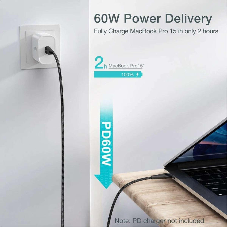 This USB C cable adopts the advanced Power Delivery 3.0 technology, providing fast charging to your phones, tablets, laptops and other USB C-enabled devices at up to 3A high speed by using 18W 30W 45W 60W 87W or 96W USB-C PD chargers. (Note: PD chargers are NOT included)