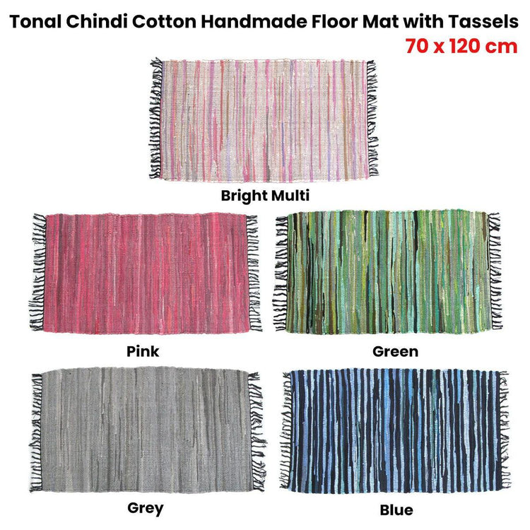 Bring a touch of style to your home with the Tonal Chindi Cotton Handmade Floor Mat with Tassels 70 x 120 cm! Handmade woven floor mat with random pattern, tassels are uneven length. This unique mat features woven design with a playful tassels accent that adds a touch of whimsy, and the soft cotton feels great under bare feet. A beautiful, textured floor mat that's as easy on the eyes as it is on your feet.
