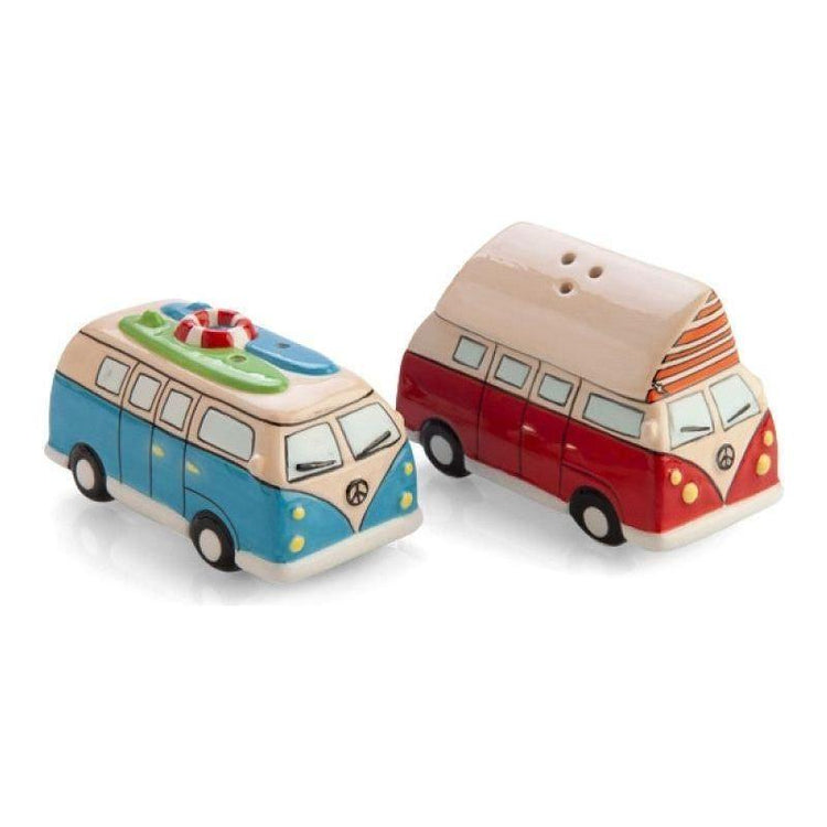 Blue combi has surfboards on its roof and red combi has a stripy pop top