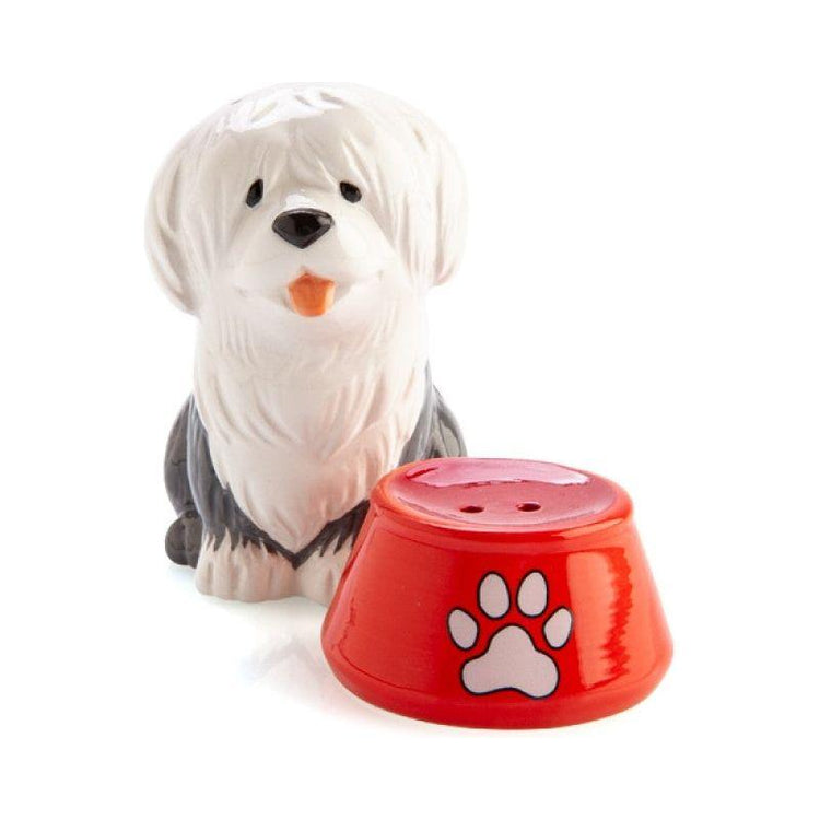 Salt and pepper set shaped like an Old English sheepdog and red dog bowl