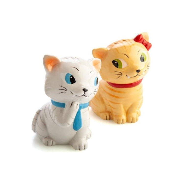 Grey cat wears a blue necktie and ginger cat wears two red ribbon bows