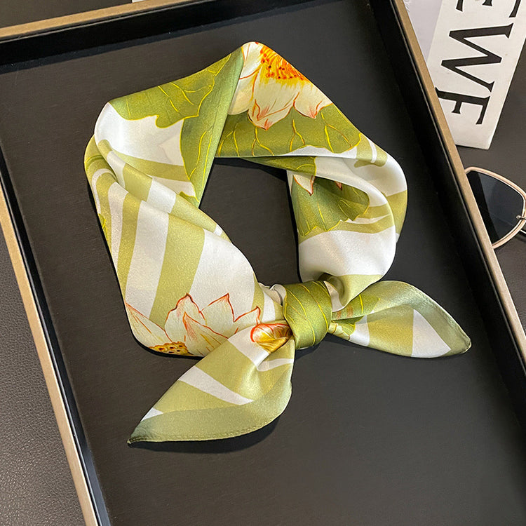 Green Lotus 53cm Silk Scarf - 100% Mulberry Silk, Floral Print, Women's Square Scarf Shawl (Style 1)