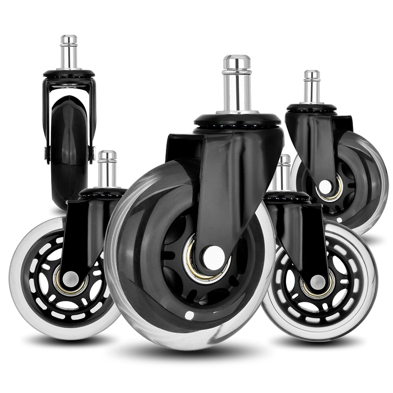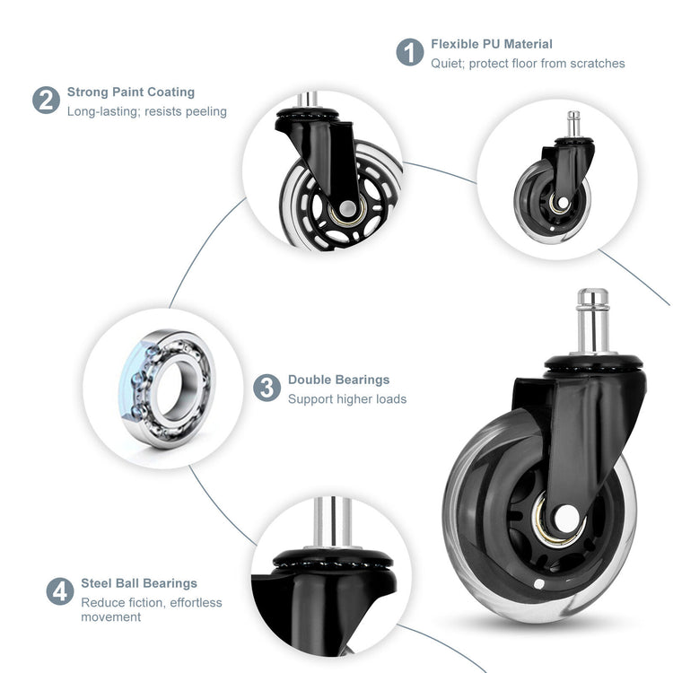 Is your office chair hard to move? Upgrade to rollerblade-style casters for effortless, quiet movement. Designed to glide smoothly across wood, carpet, tile, and marble, they enhance the comfort and efficiency of your workspace.