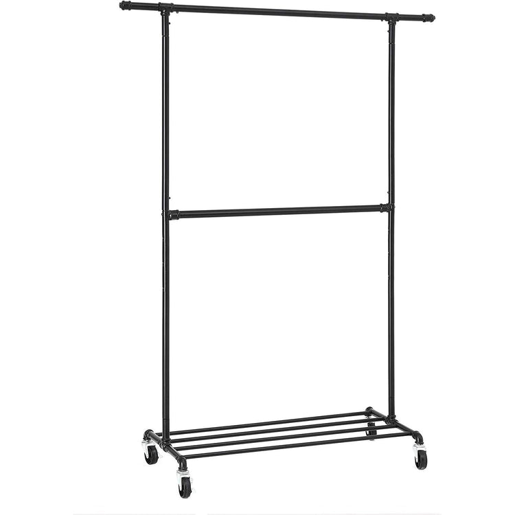 - Create a stylish and organized bedroom with this adjustable pipe rack. Featuring a double rod with an adjustable center rod at four different heights, you can easily hang gowns, t-shirts, overcoats, and trailing dresses. The extended top bars provide extra space for hanging items, while the bottom shelf is perfect for storing shoes and bags. Make the most of your bedroom space with this convenient and versatile pipe rack.