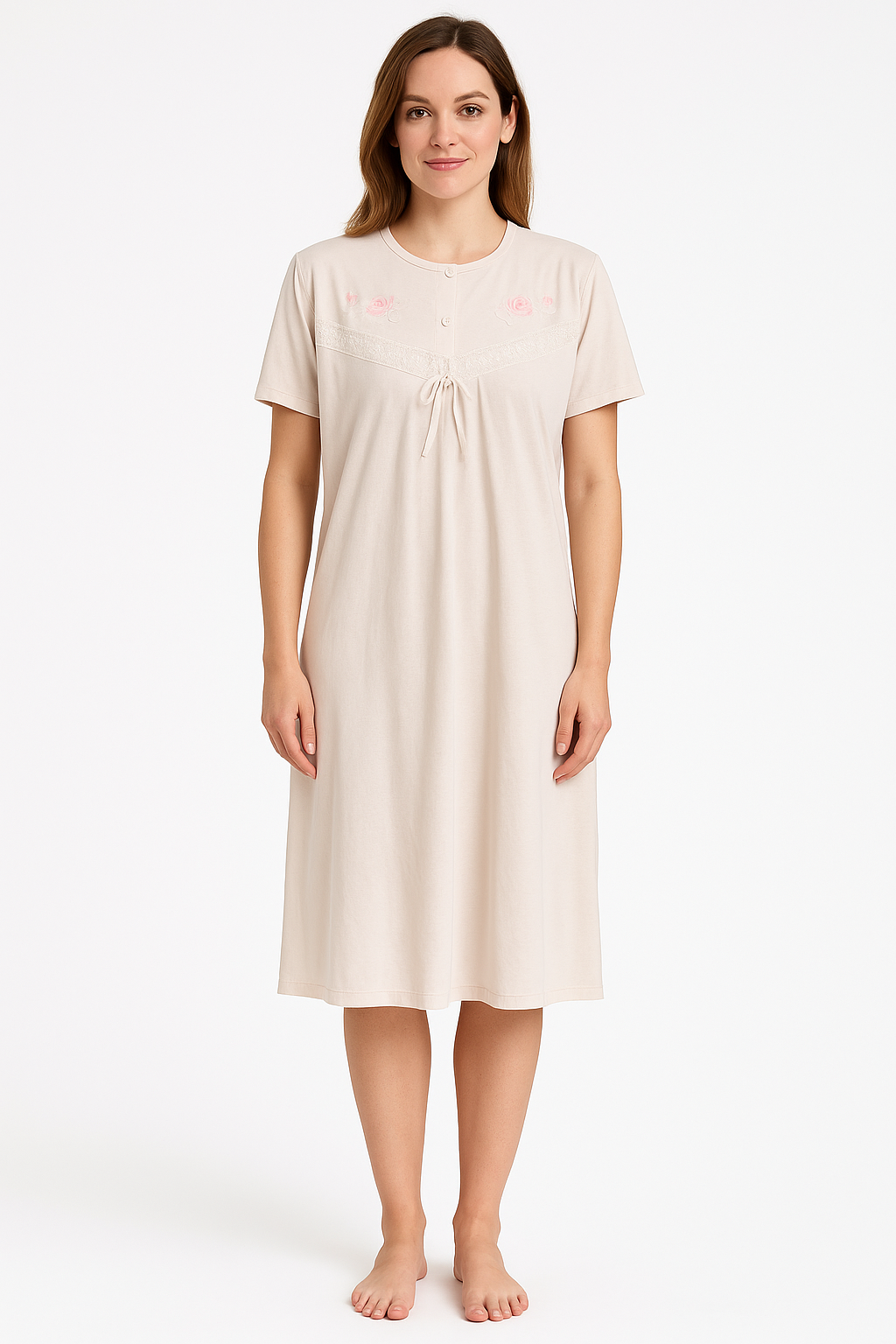 Slip into something wonderfully soft at the end of the day with this classic cotton blend nightie – your go-to for comfort, charm, and a great night's sleep. With delicate lace and sweet embroidery stitched across the chest, this gown is as pretty as it is practical. Lightweight and breathable, it's perfect for year-round lounging, whether you're pottering around the house or winding down for the night.