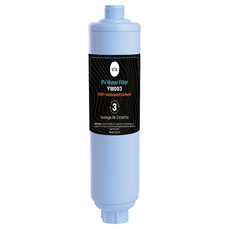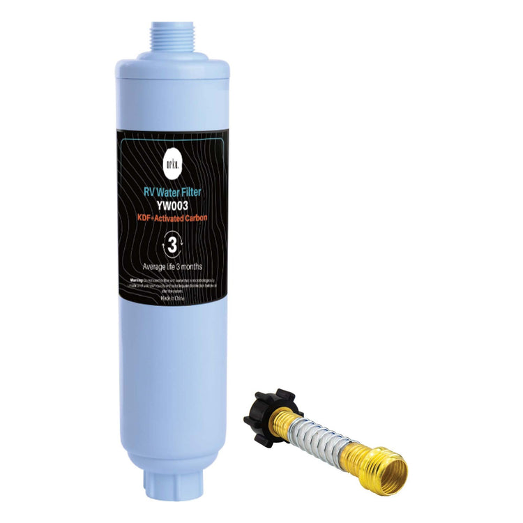 Inline RV Water Filter comes with a garden hose attachment. Made with Natural Coconut shell activated carbon, It is UV resistant and BPA free.