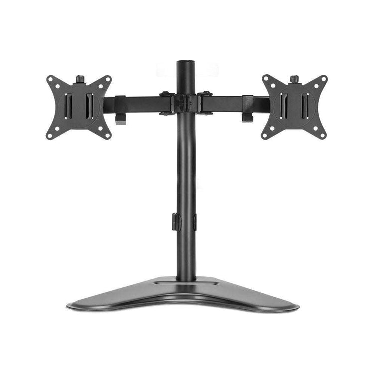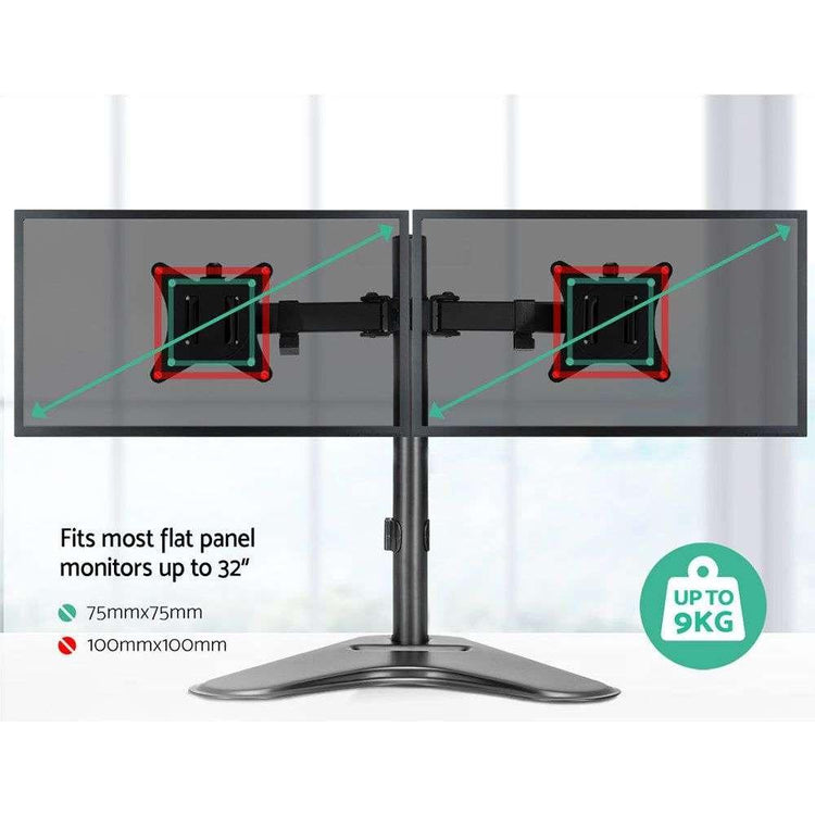 Add some extended mobility to your monitor with our Artiss Fully Adjustable Double Monitor Arm. With it, you can extend both arms up to 43cm to set your preferred viewing position and retract it with ease. Height adjustments can be easily done by twisting the height adjustment screw. It also allows you to swivel your monitor 180°, rotate it 360° or tilt it up to 45° and set in either landscape or portrait format. Using the detachable VESA mount, you can mount any monitor size of up to 32"* with a maximum weight capacity of 9kg on each arm. Plus, you can also fine tune the monitors' alignment with the VESA plate height adjustment. Other great features include a freestanding V-shaped base that does not need any drilling or clamping, cable loops for neat and tidy cabling and a tools holder for allen keys. Not least, made from heavy-duty steel, the monitor arms are designed to stand up to longlasting use without missing a beat. All the necessary mounting hardware and an assembly manual are included in the package for a hassle-free set up.