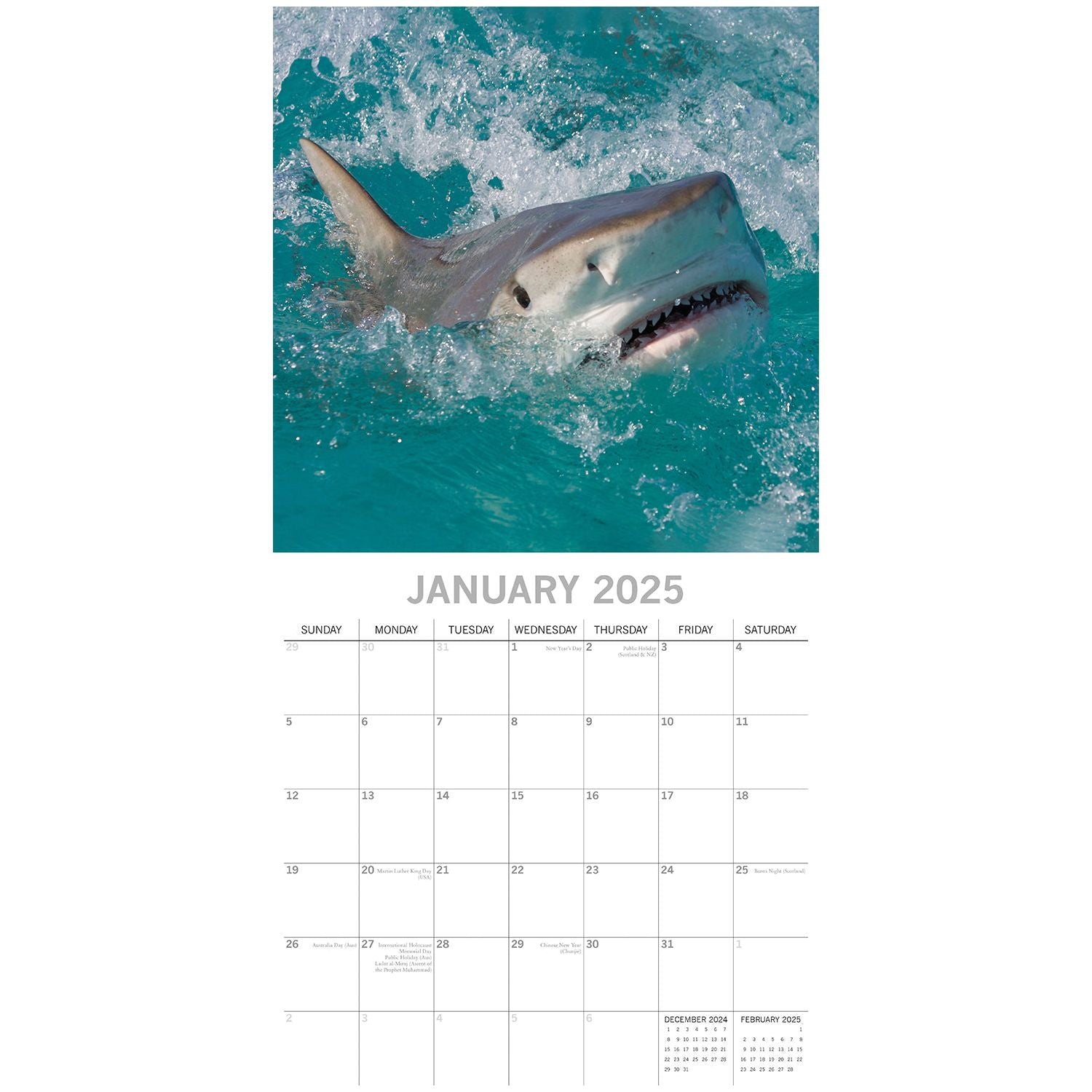 Shake off the stereotype of Jaws and feast your eyes on the beauty of this Sharks calendar for 2025. This misunderstood animal is captured under the sea in its natural habitat.This beautifully designed, brand-new calendar is both 100% plastic-free and fully recyclable. It comes shrink-wrapped in its original packaging and features: