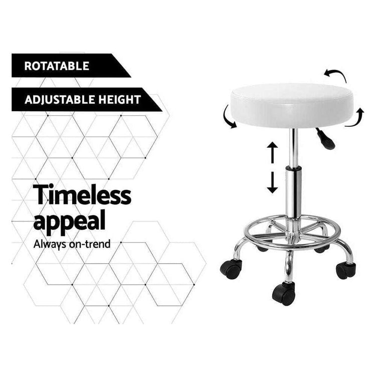 Looking to add a glamourous touch to your salon? You can do it effortlessly with the Artiss'gorgeous salon stool. It's not just for a salon, but you can use these stools in your tattoo parlour, medical clinic, cafe, and music studio. Our salon style stools will instantly give your space a stylish and modern look. These stools are designed for ultimate comfort and convenient use. It features a round seat design that makes you feel comfortable even if you've been sitting for long hours. The thick foam padding makes the seat soft, and the PU leather upholstery with a light sheen highlights its alluring texture. Our salon stool also has five nylon smooth castor wheels that offer easy manoeuvrability. The seat is 360° rotatable, enabling you to face any direction. It also comes with a heavy-duty footrest and base for added stability and comfort. You can even adjust its height with an SGS-certified gas lift lever. So why wait? Purchase this beautifully designed salon stool. You won't regret it.