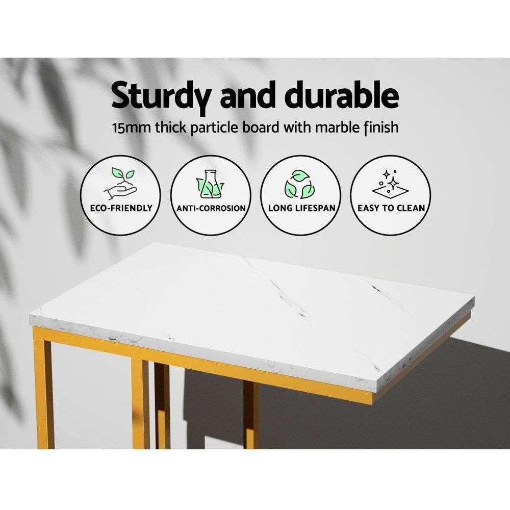 Elevate your living room with this modern and functional coffee table. With its clean lines and smooth edges, our Martha side table will complete the minimalist look and give your space an industrial-style inspired feel. The side table features thick tabletop particle board construction with marble finish and solid metal frame, which ensures longlasting use and ultimate durability. It'll withstand the rigours of everyday use. Equipped with floor protectors, our side table prevents your floors from getting scratches. It has a hollow rectangular base that guarantees optimum stability. This side table has an excellent weight holding capacity and offers good resistance against corrosion. It's also easy to clean. Furthermore, the side table is sleek and elegant, which also helps save space without compromising on its practicality, style, and usefulness. A piece so practically and thoughtfully designed, the Artiss Martha makes a must-have piece of furniture in every home. Shop it today.
