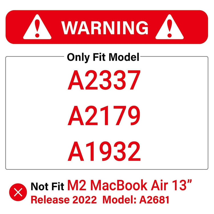 Not Fit - This case is NOT compatible with 2022 M2 MacBook Air 13 Inch (Model: A2681) and Older MacBook Air 13 Released BEFORE 2018 (Models: A1466/A1369). Please kindly check the model number at the bottom of your laptop "A****"