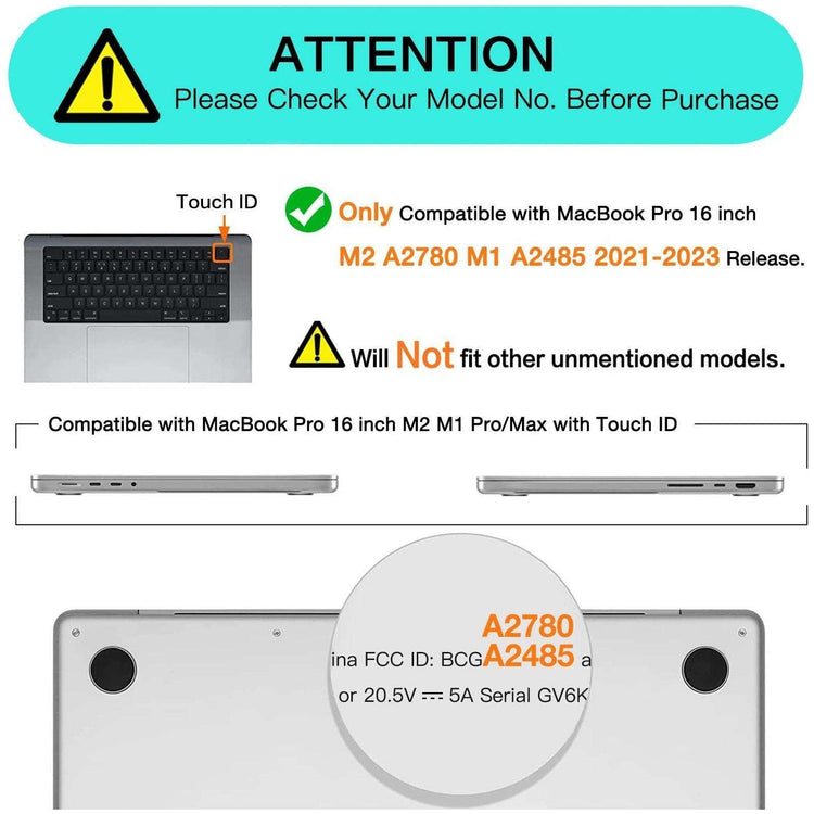 Please note that this case is not compatible with all models of 13" MacBook Pro, 15" MacBook Pro, or 14" MacBook Pro. Please kindly ask you to check the model number located at the bottom of your laptop to ensure compatibility.