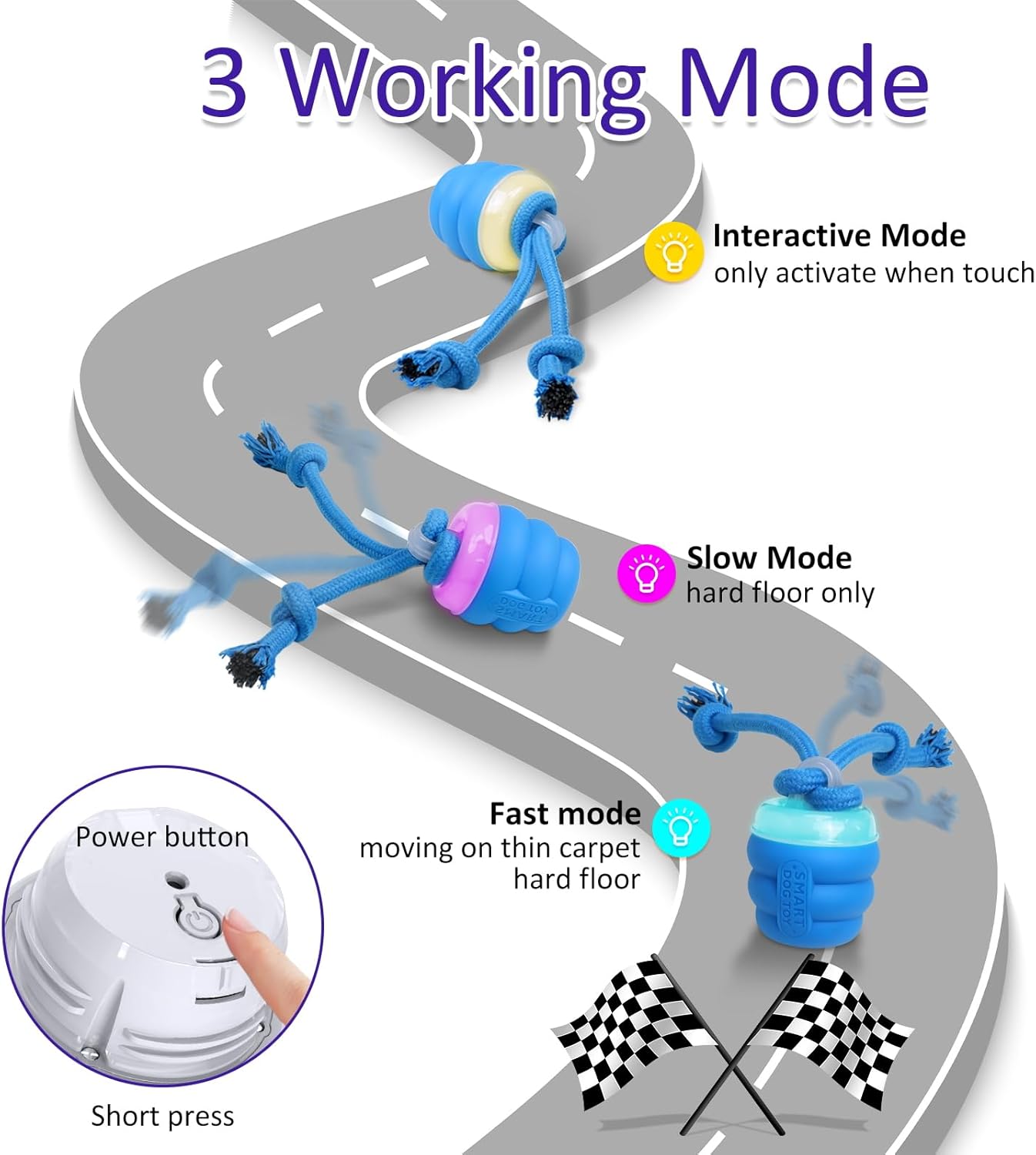 Works 5mins and standby for 1H, automatic on for 15s shaking to attract dogs playing game