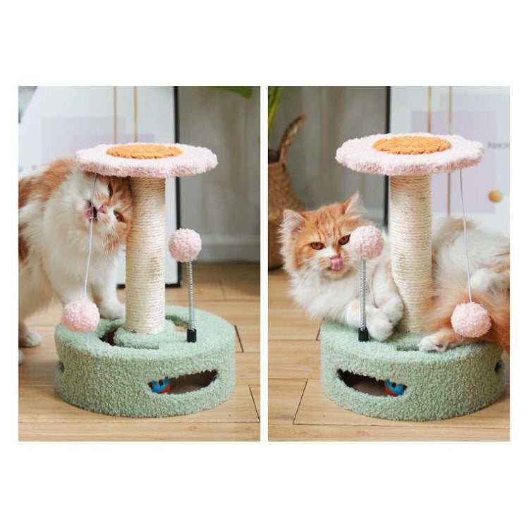 Yellow-pink Interactive Cat Scratching Post with Playful Ball Toys, Flower Design - 35cm Height, 26cm Base
