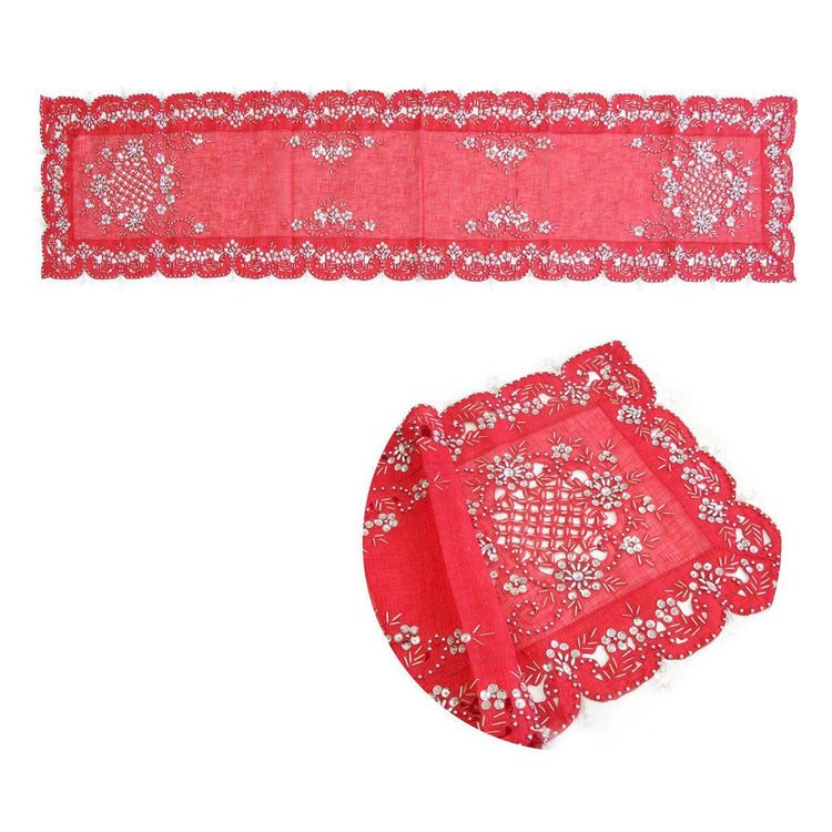 Add a classic style to your dining table with this Aurora Beaded Table Runner Diamonte Sequin 40 x 180 cm. Perfect to add decorative accent to your table for everyday dining or special occasions. It features an elegant beads and sequins design in vivid colour hues of red, silver, and white for a chic table look. It is made from Polyester fabric.