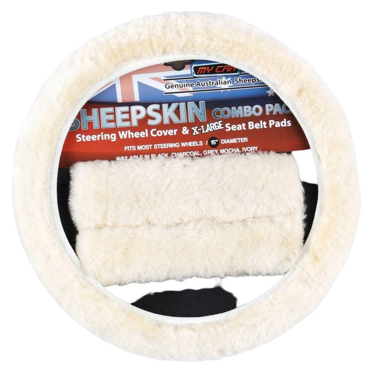 Sheepskin Steering Wheel Cover & Seat Belt Pads Combo Luxury - Ivory
