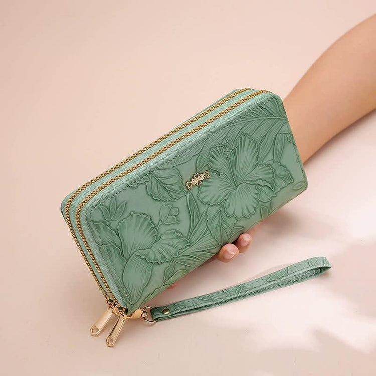2 PCS Green Elegant Floral Embossed Long Wallet with Double Zipper