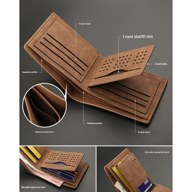 Discover the perfect blend of vintage aesthetics and practical design with our Men's Bifold Wallet. Crafted from high-quality retro-style PU leather, this wallet offers a sophisticated look while providing ample space for all your essentials. Its smart, organized layout makes it the ideal accessory for business, casual, and everyday use.