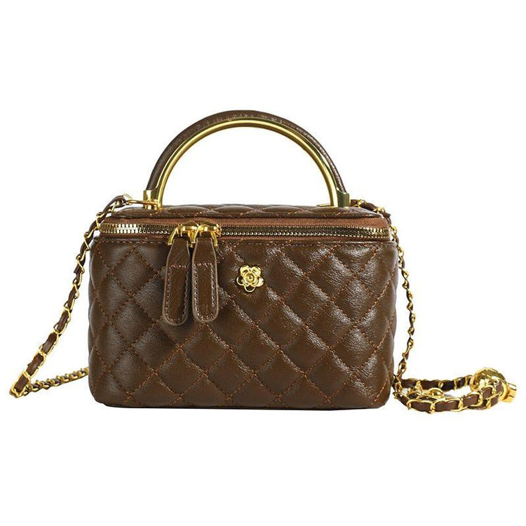 Brown Luxury Quilted Mini Box Handbag with Chain Strap and Metal Handle - Elegant Evening Purse