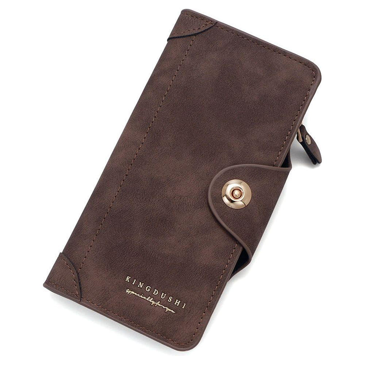 Brown Women's Long Zipper Wallet with Button Closure - PU Leather Multi-Compartment Clutch Purse