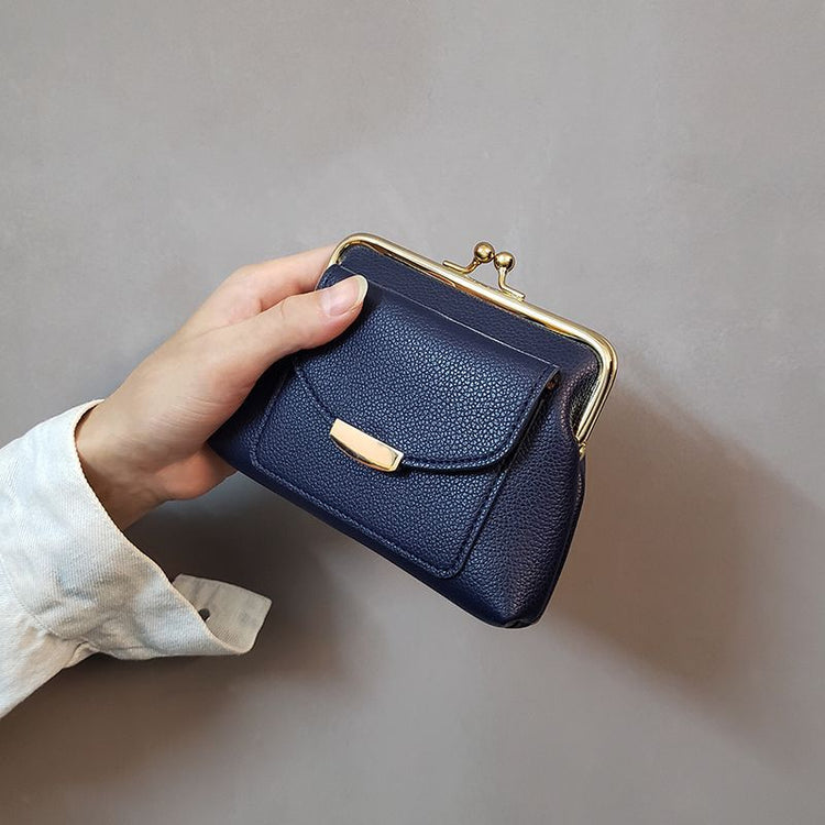Dark Blue Vintage Style Women's Kiss Lock Coin Purse - Compact PU Leather Wallet with Card Holder