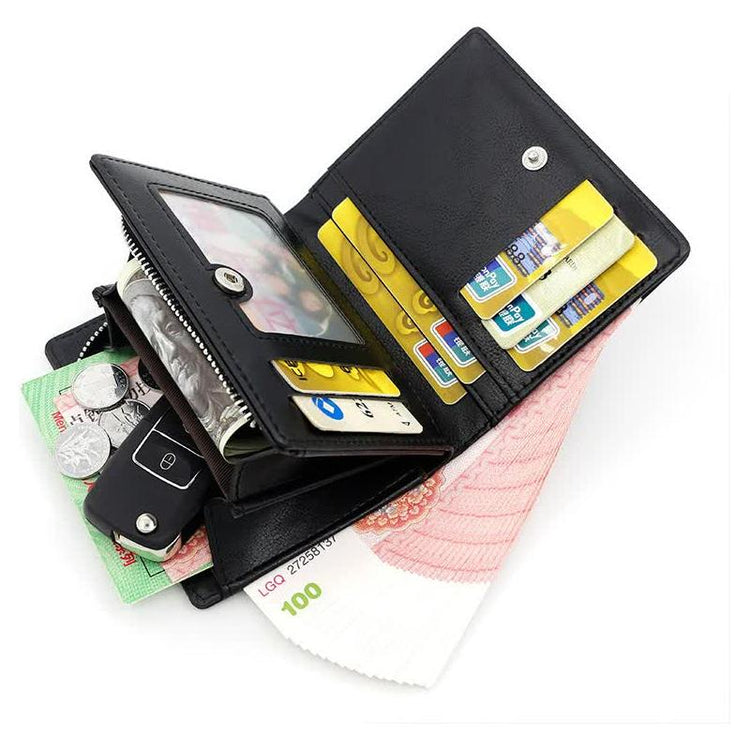 • Multiple Compartments: Includes slots for cards, cash, coins, and an ID window for easy access.
