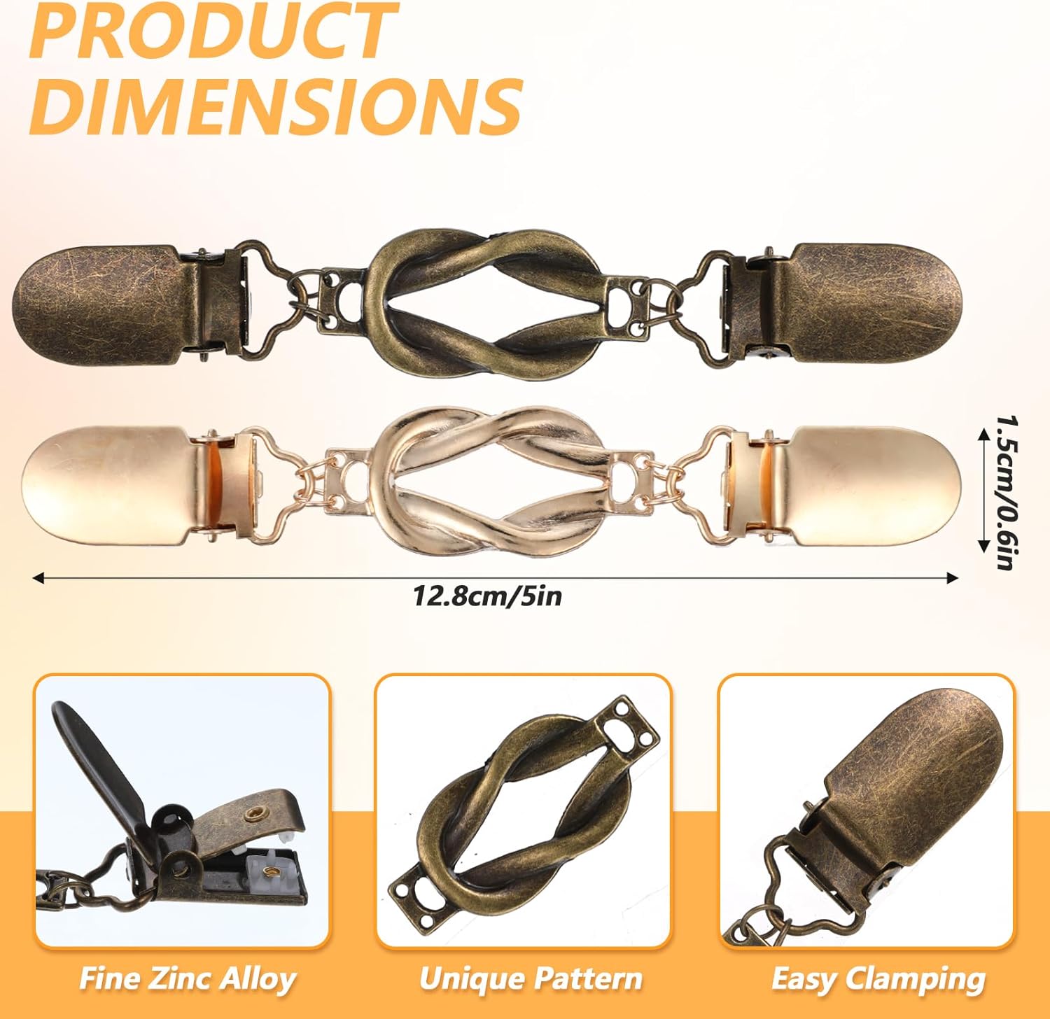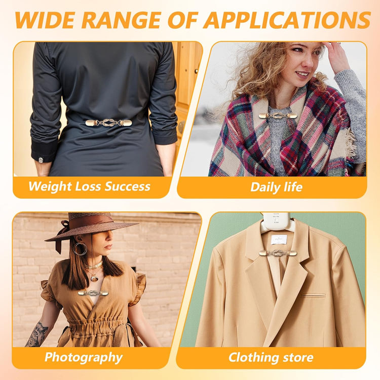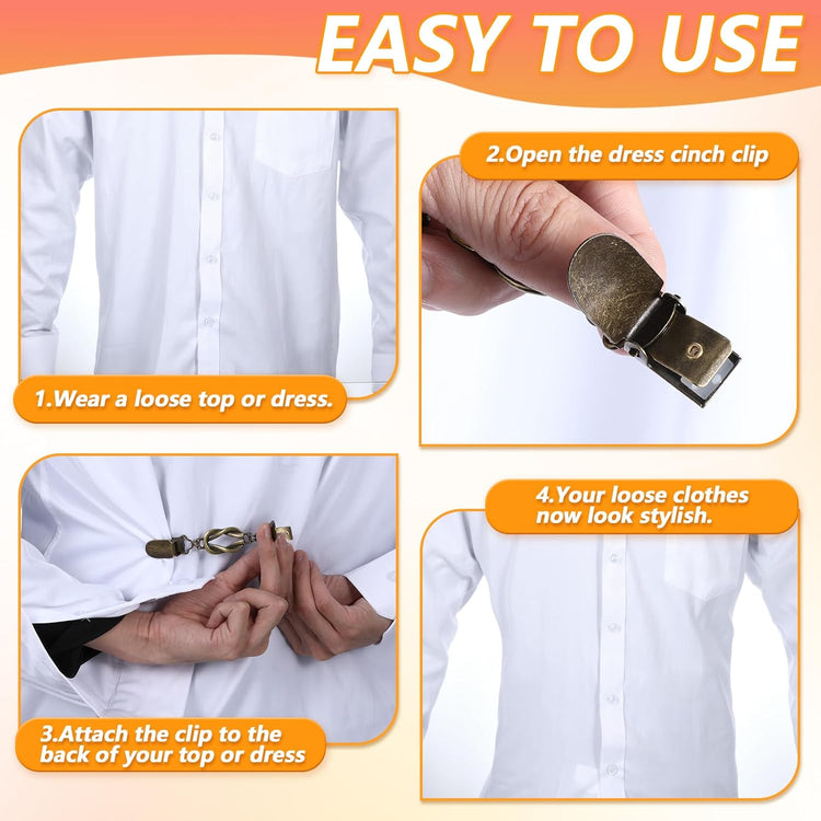 Each cinch clip measures 12.8cm in length and 1.5cm in width (5 x 0.6 inches), making them suitable for a wide range of clothing items. The smooth finish of the clips protects your garments from scratches, while the elegant gold, silver, and copper colors add a touch of sophistication to any outfit.