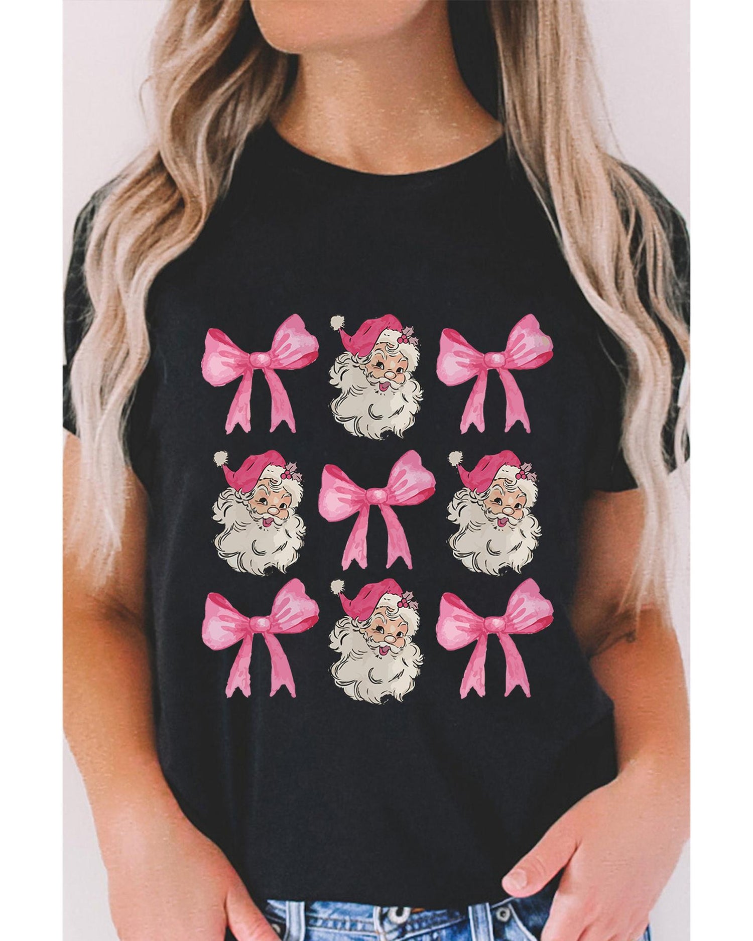 - Festive Black Santa Claus Bow Knot Christmas Graphic T Shirt