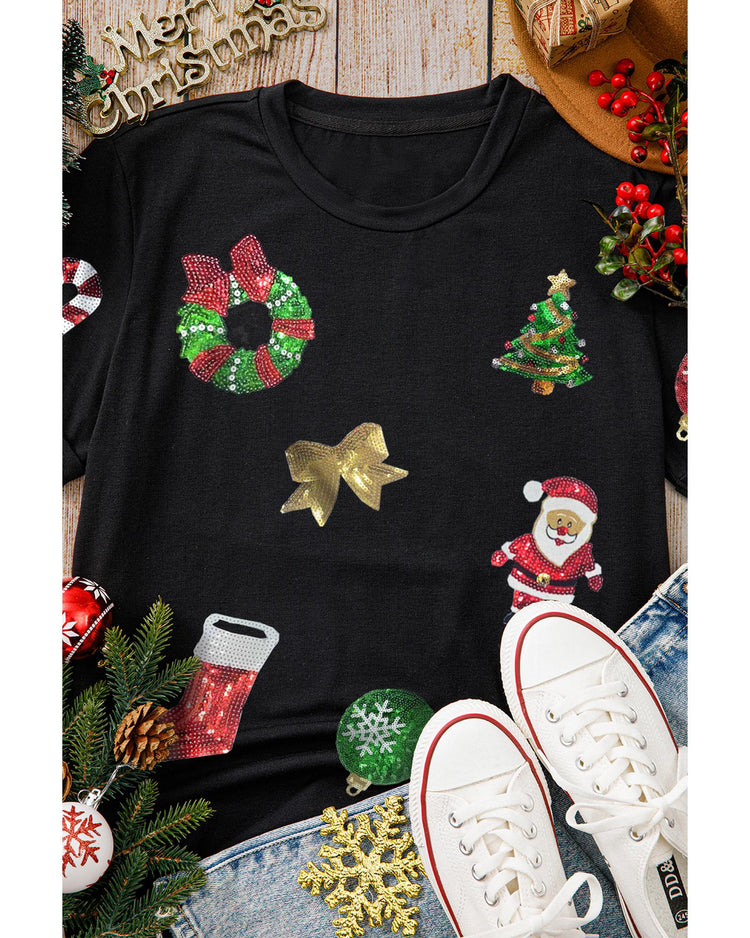Black Sequin Christmas Essentials Graphic Crewneck T Shirt - L