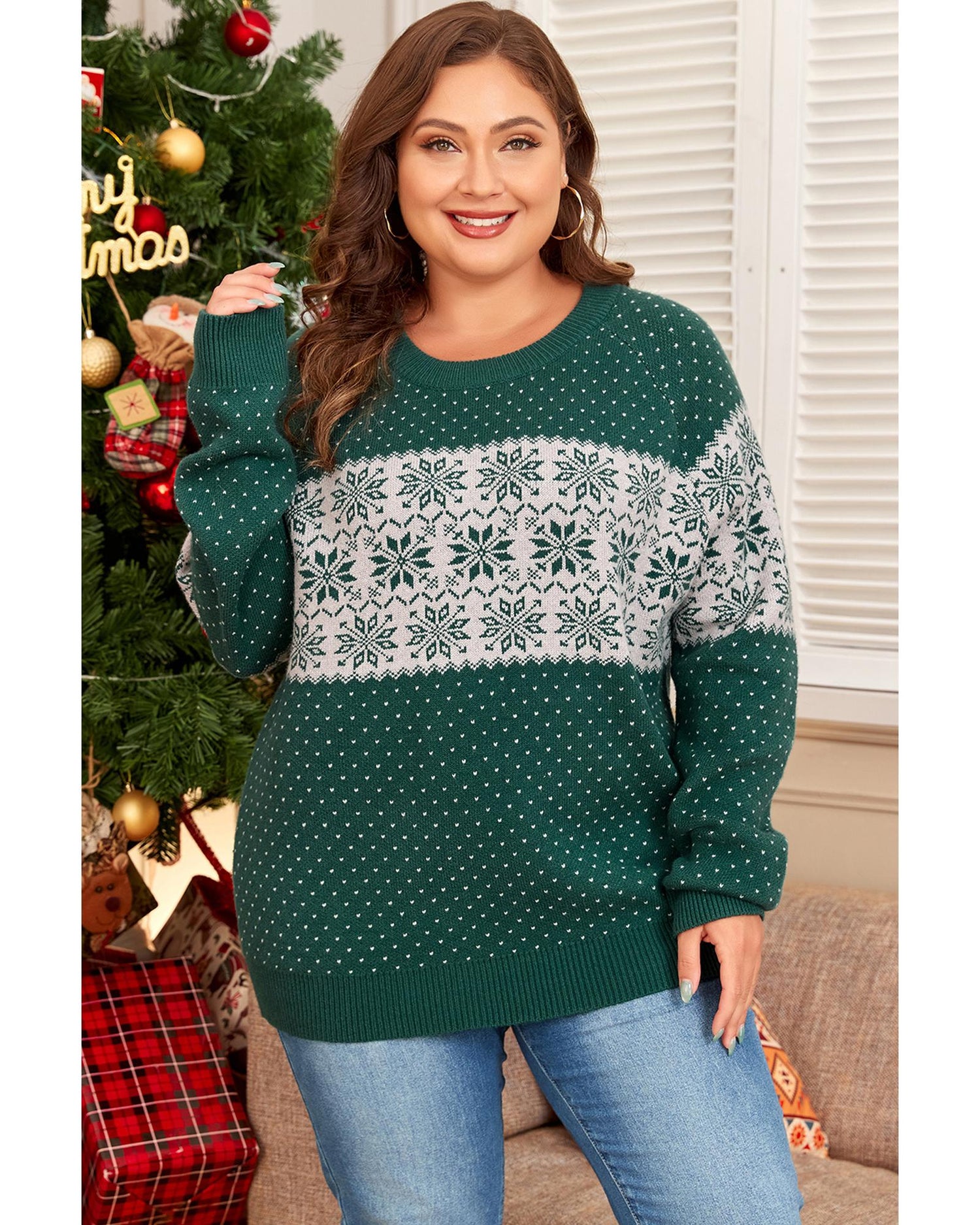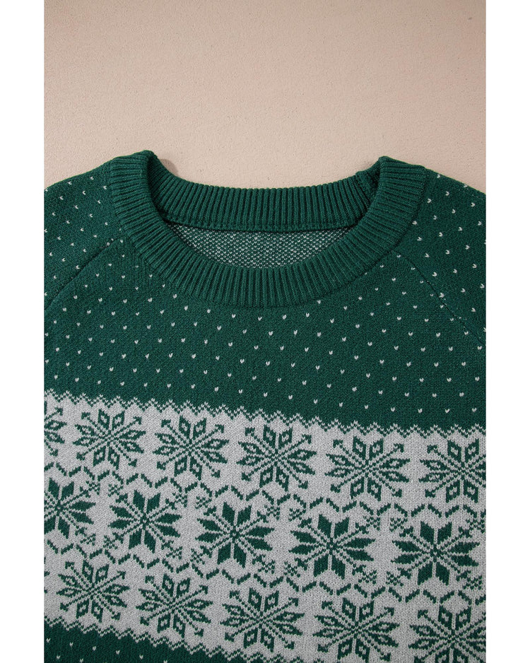 Green Christmas Snowflake Pattern Drop Shoulder Plus Size Sweater - 2X