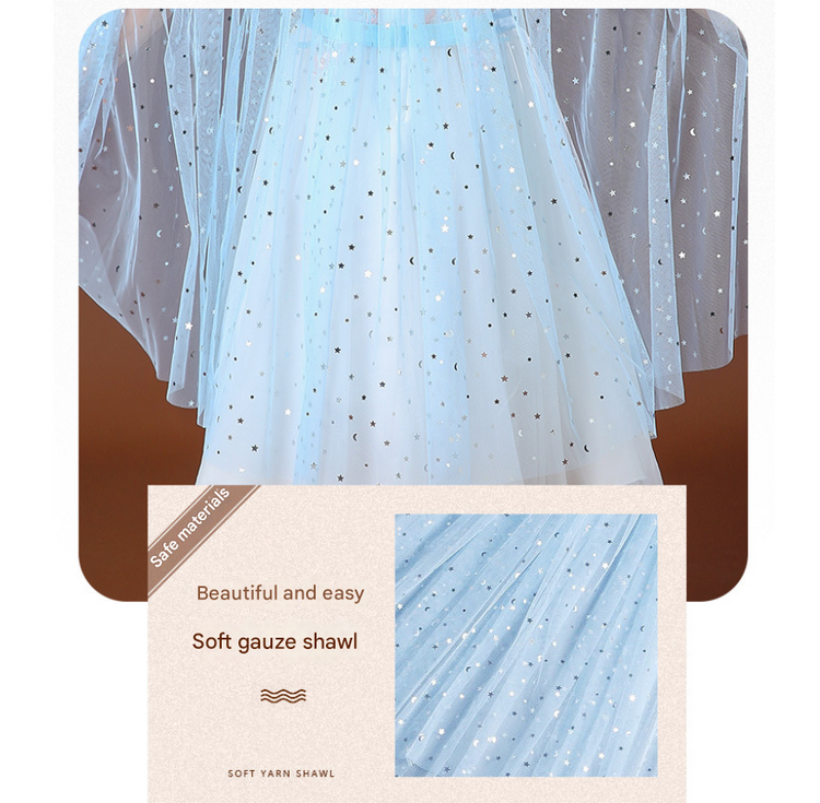 - Dazzling Rainbow Cape: The sheer tulle cloak features a beautiful gradient of pastel colours adorned with shimmering gold stars, creating a magical effect as it moves.