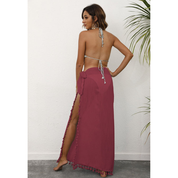 Embrace the sun and sand with our stylish tassel trim beach sarong! This captivating wrap skirt is designed to enhance your swimwear ensemble with a touch of flirty elegance.