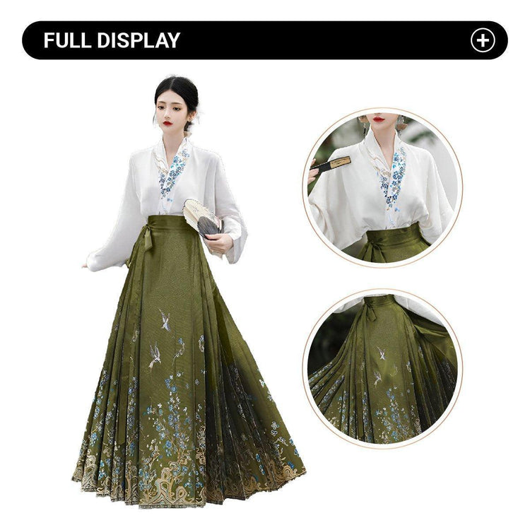 Step into timeless elegance with this New aircraft sleeve horse skirt set for women. Designed for spring and autumn, this improved daily Hanfu is perfect for commuting and casual wear. The set includes a beautifully embroidered white top with a one-word collar and a flowing bean green skirt adorned with delicate bird and floral patterns. Made from premium materials, this Hanfu combines traditional aesthetics with modern comfort.