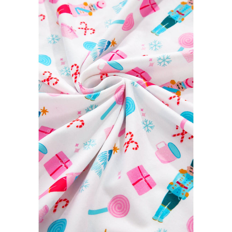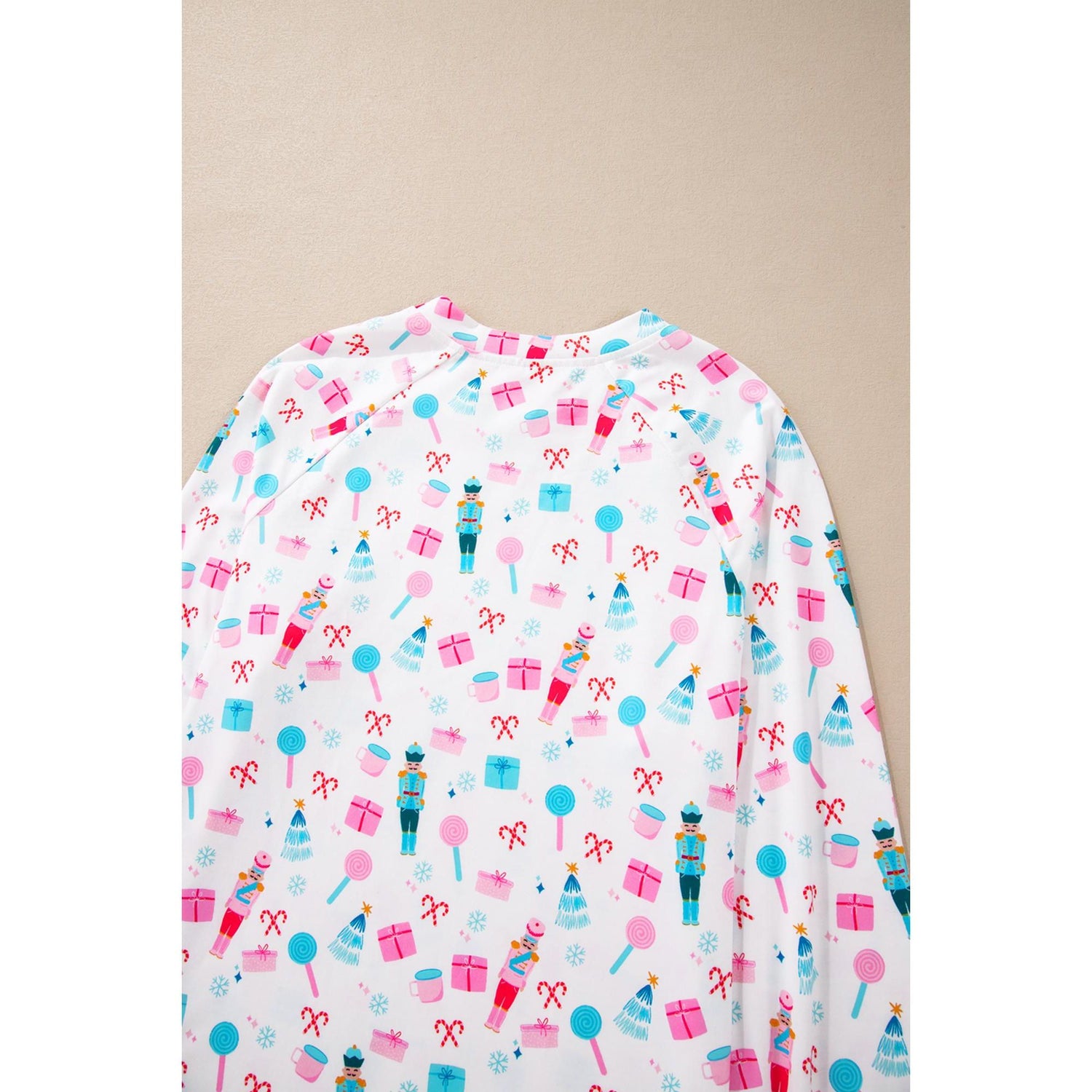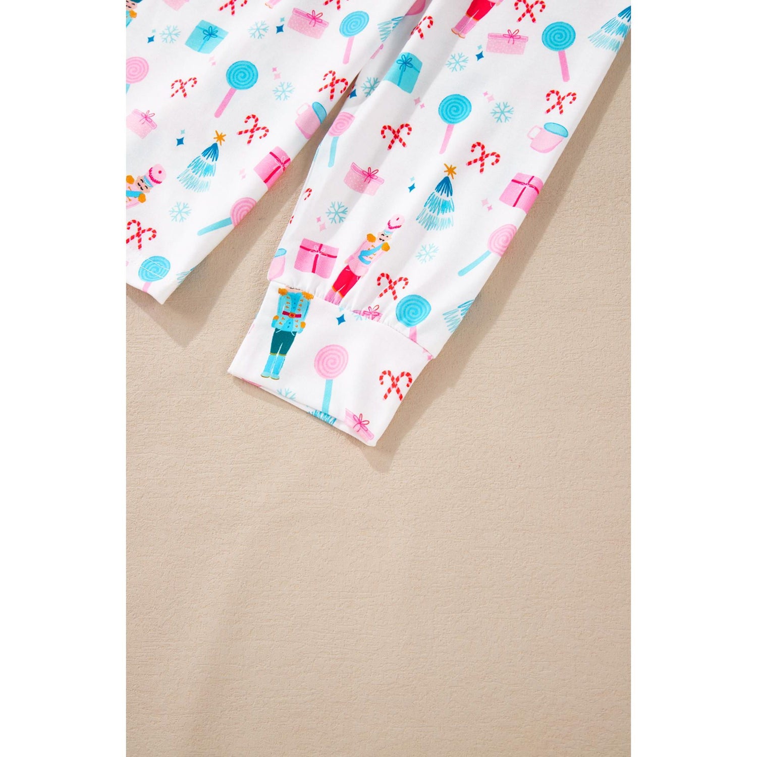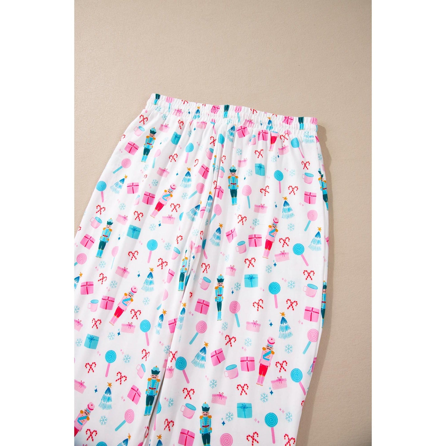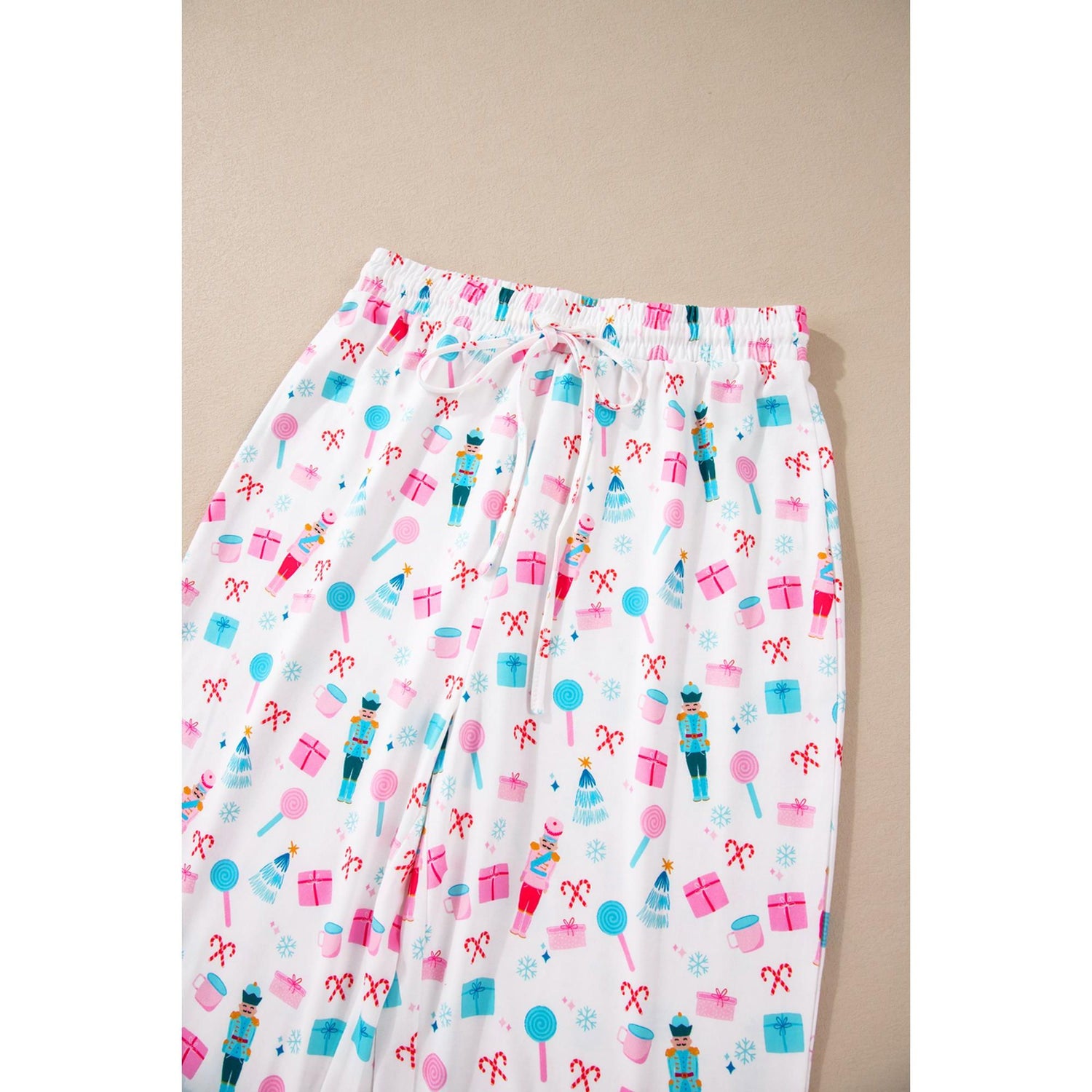White Christmas Pattern Long Sleeve Top and Wide Leg Pants Set - XL