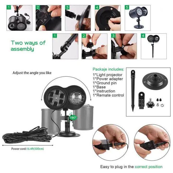 Enhance your outdoor space with the Outdoor Waterproof Lawn Dual-Tube Projection Light. Featuring stunning dynamic water ripple animations, this LED projector is perfect for Halloween, Christmas, and other festive celebrations. With 12 replaceable slides, you can customize the projections to fit any occasion. The light can be easily mounted with either a ground stake or a stand, making it versatile and easy to set up for any event.