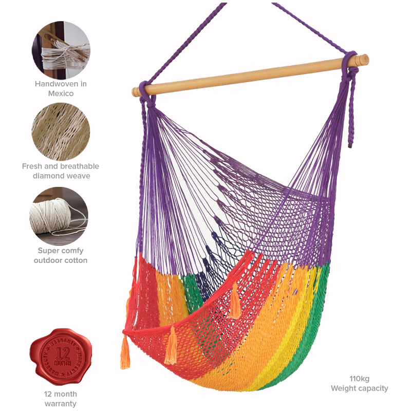 Our Mexican hammock chairs are just amazing with the bonus of a comfy back support, difficult to find elsewhere. Because they're extra large you can relax vertically or horizontally, anywhere you want, you choose.