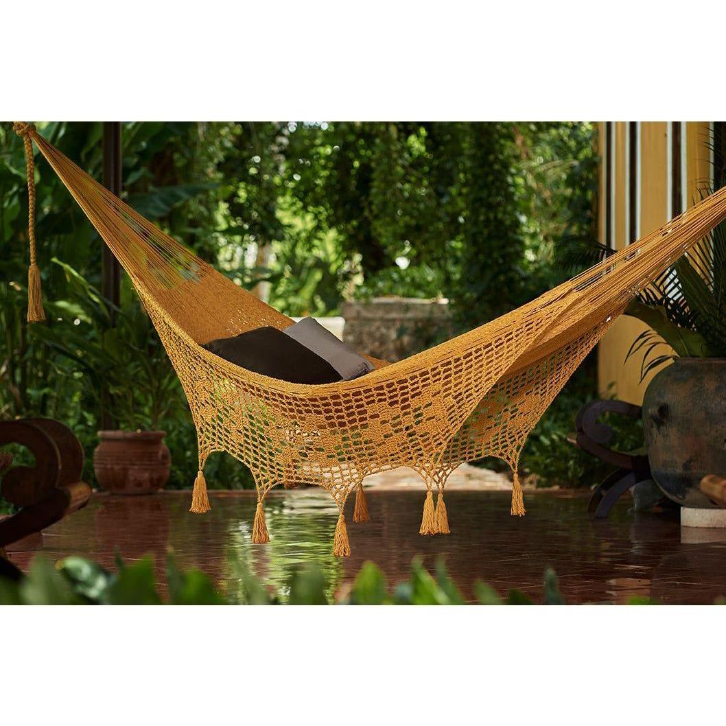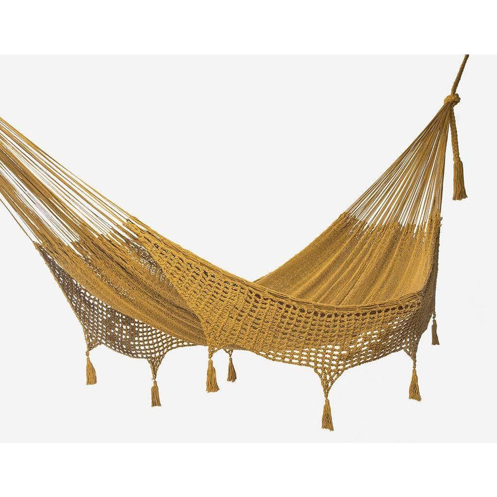 Outdoor undercover cotton Mayan Legacy hammock with hand crocheted tassels King Size Mustard