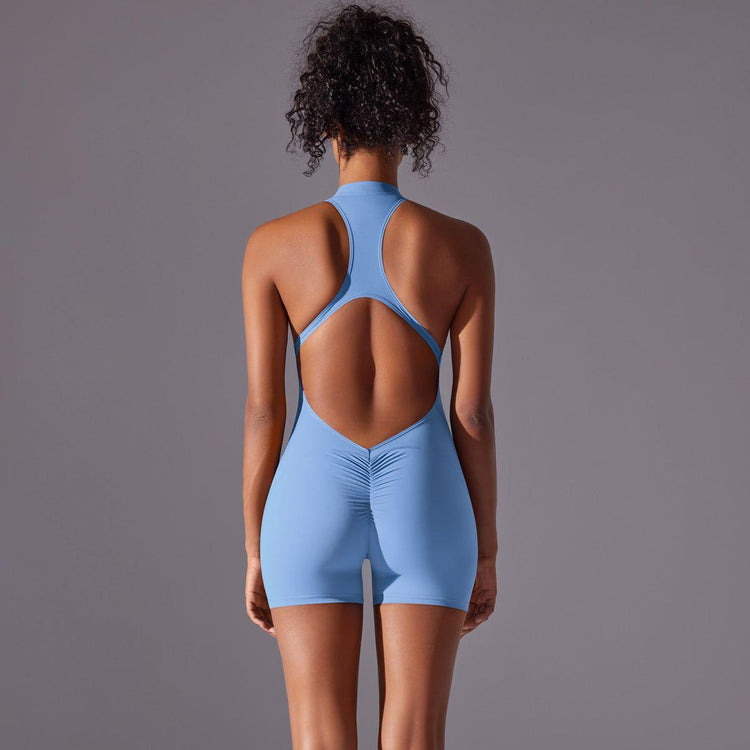 Experience the perfect combination of style and performance with our high-impact seamless bodysuit. Designed for comfort and support during intense workouts, this form-fitting romper is made from a premium nylon/spandex blend that offers a "nude feel" sensation. Features a flattering open-back design, a high neckline with a front zipper, and a ruched detail at the rear for a beautiful silhouette. Ideal for yoga, running, gym sessions, and more!