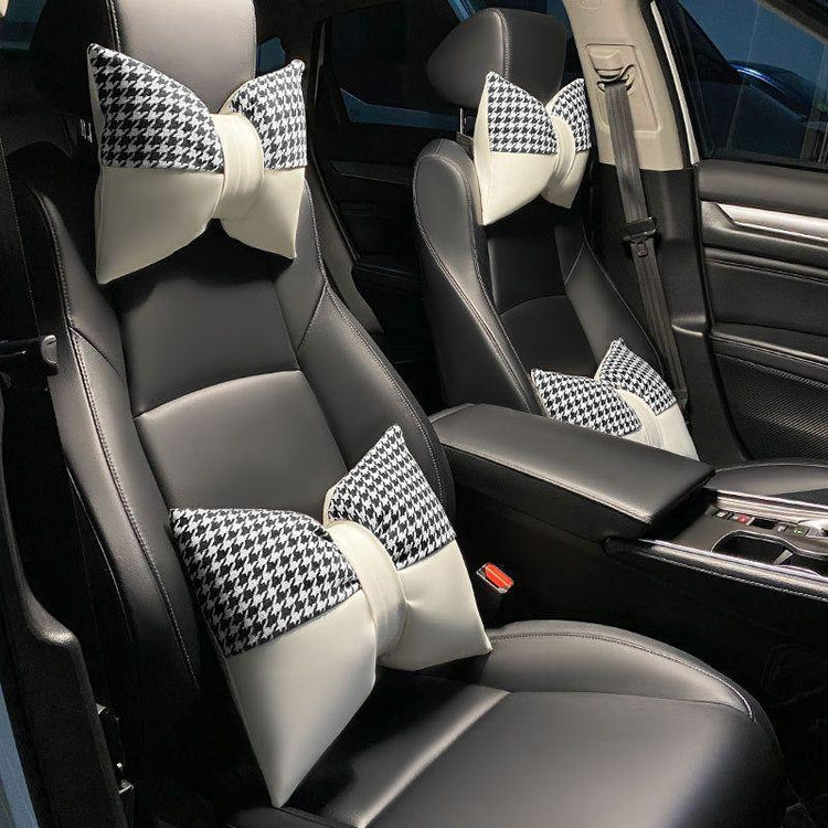 Cute Bowtie Car Headrest Pillow and Waist Cushion Set, Stylish Houndstooth Design, Soft Neck and Back Support for Car Interior
