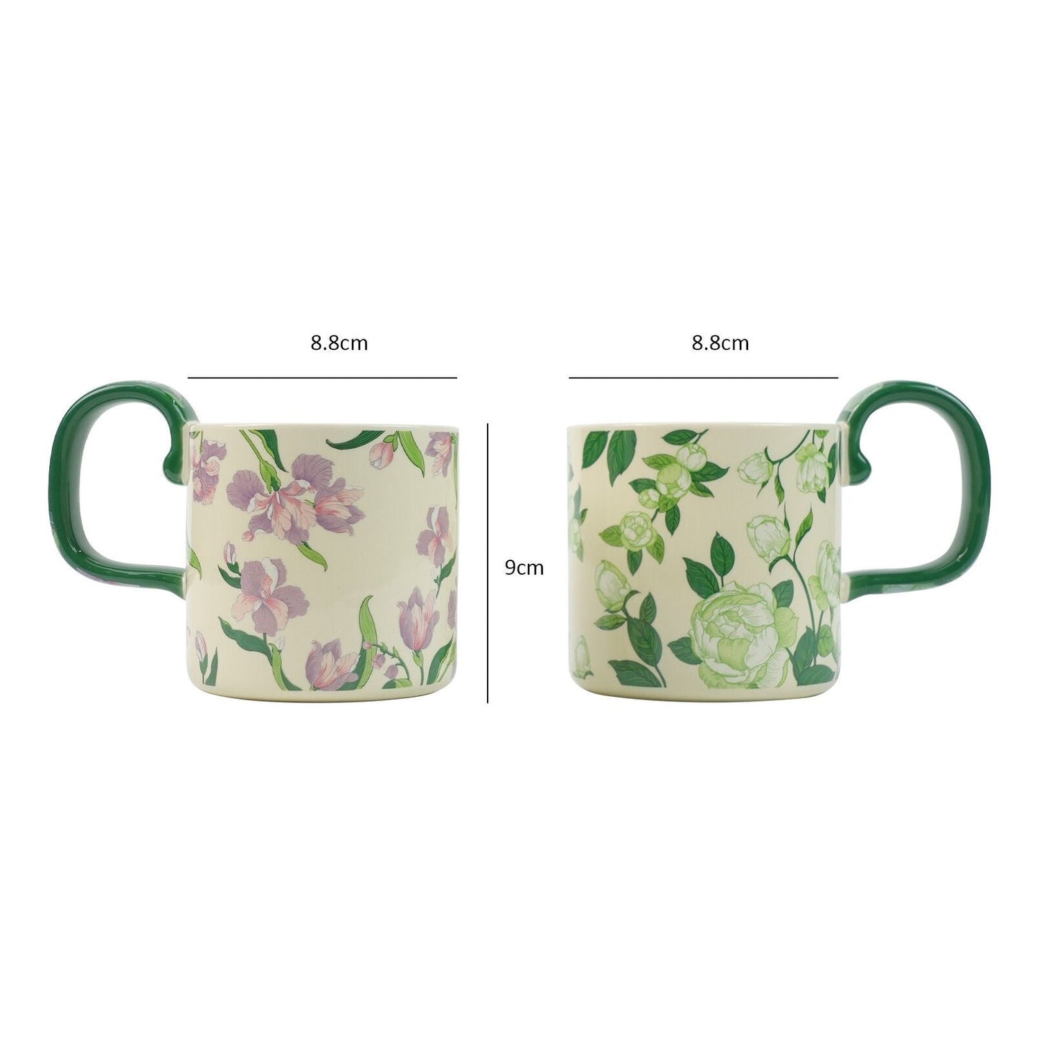 Introducing the Vintage Floral Mug Set, featuring two mugs with distinct handle shapes. One mug showcases a delicate iris design, while the other features a classic rose pattern, both with intricate vintage-style details. What�s more, the handles feature a charming floral pattern. This set is beautifully packaged in a gift box, making it an ideal gift for special occasions or a charming addition to your own collection.
