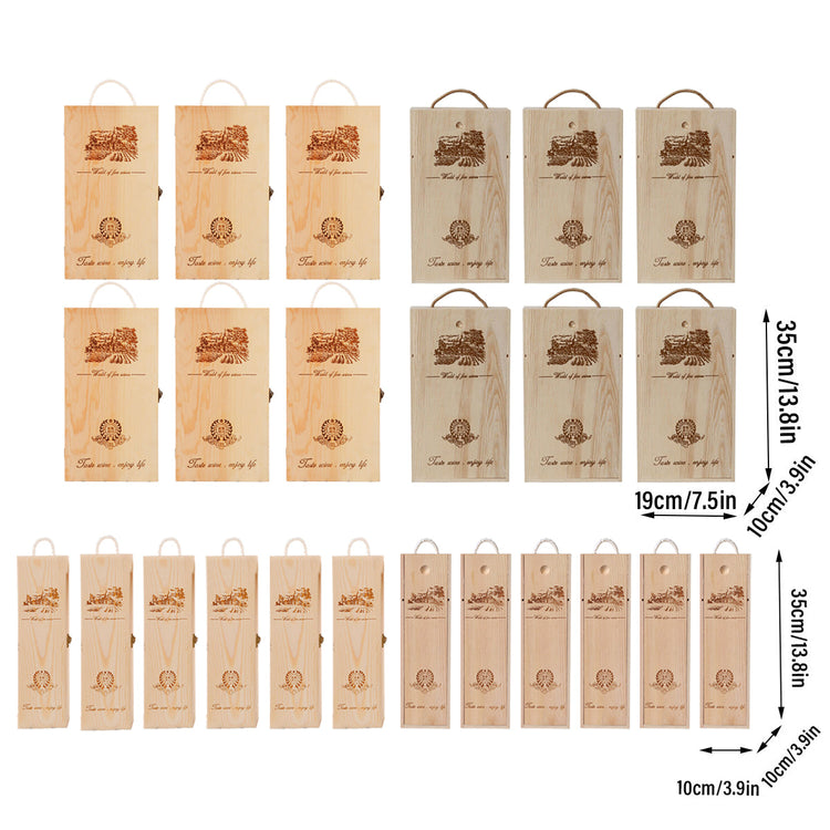This set of 6 wooden wine boxes is designed for those who appreciate both style and functionality. With a simple yet elegant clamshell design and a retro switch for easy access, these boxes offer a sophisticated way to present red wine bottles. Perfect for gifting wine during weddings, parties, corporate events, or any special occasion, each box can hold either a single bottle or two bottles. Crafted from durable hardwood, these boxes provide secure protection while enhancing the presentation of your wine.