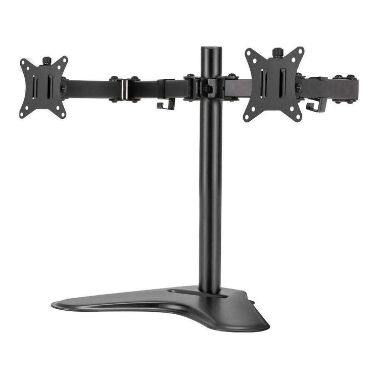 Add some extended mobility to your monitor with our Artiss Fully Adjustable Double Monitor Arm. With it, you can extend both arms up to 43cm to set your preferred viewing position and retract it with ease. Height adjustments can be easily done by twisting the height adjustment screw. It also allows you to swivel your monitor 180°, rotate it 360° or tilt it up to 45° and set in either landscape or portrait format. Using the detachable VESA mount, you can mount any monitor size of up to 32"* with a maximum weight capacity of 9kg on each arm. Plus, you can also fine tune the monitors' alignment with the VESA plate height adjustment. Other great features include a freestanding V-shaped base that does not need any drilling or clamping, cable loops for neat and tidy cabling and a tools holder for allen keys. Not least, made from heavy-duty steel, the monitor arms are designed to stand up to longlasting use without missing a beat. All the necessary mounting hardware and an assembly manual are included in the package for a hassle-free set up.