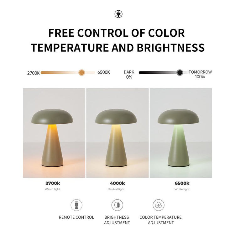 Transform your living space with this Metal Mushroom Table Lamp. Designed with a sleek, modern mushroom shape, this rechargeable ambient light is perfect for living rooms, restaurants, bars, or as a stylish bedside night light. Featuring touch control and a remote, it offers customizable color temperatures and brightness levels to suit any mood or occasion.