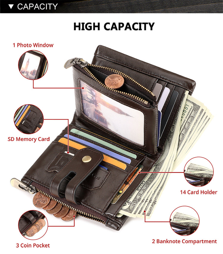 - High-Capacity & Organised: Features 14 dedicated card slots, 1 clear ID or photo window, 2 full-length banknote compartments, and a secure zippered coin pocket to keep everything neatly in place.