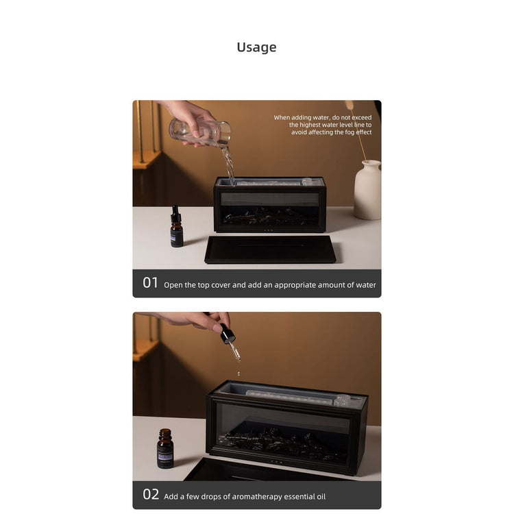 Create a warm and inviting atmosphere in any room with our Fireplace Flame Effect Aroma Diffuser. This unique device combines the functionality of an essential oil diffuser and a humidifier with the stunning visual appeal of a miniature fireplace. It uses ultrasonic technology to produce a fine, fragrant mist that won't dampen your tabletops, helping you relax your mind and body. The diffuser features a realistic simulated flame effect, along with a 7-colour flame light option to create a cozy ambiance. Control the device easily with the included remote control or the buttons on the unit. Features include adjustable lighting, multiple timer settings (6, 8, and 10 hours), and a generous 280mL water tank for prolonged operation.