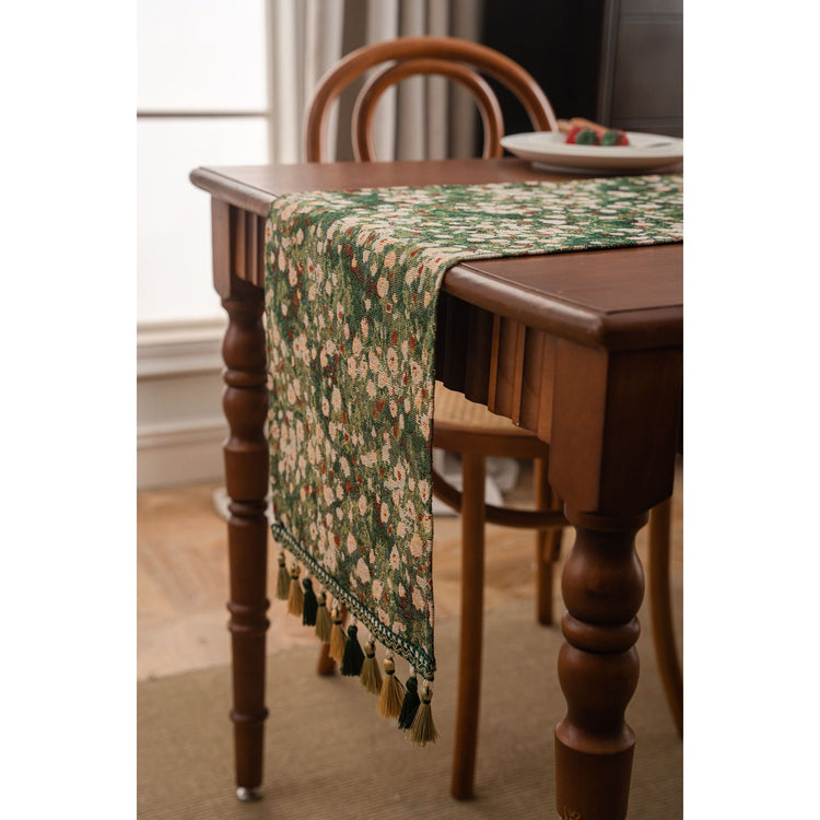 Elevate Your Dining Table with Our Green Floral Tassel Table Runner!
