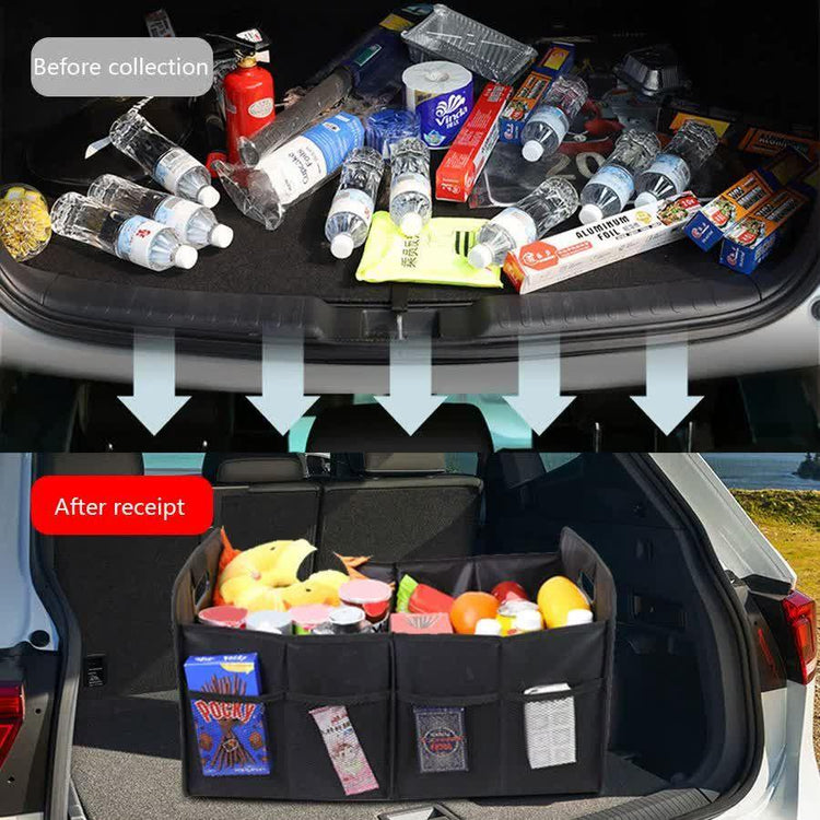 Foldable Fabric Car Trunk Organizer - Keep your vehicle organized with this versatile and collapsible storage box. Designed for easy storage and portability, this organizer is perfect for storing groceries, tools, sports equipment, and more. Its sturdy construction ensures durability, while the foldable design allows for convenient storage when not in use.