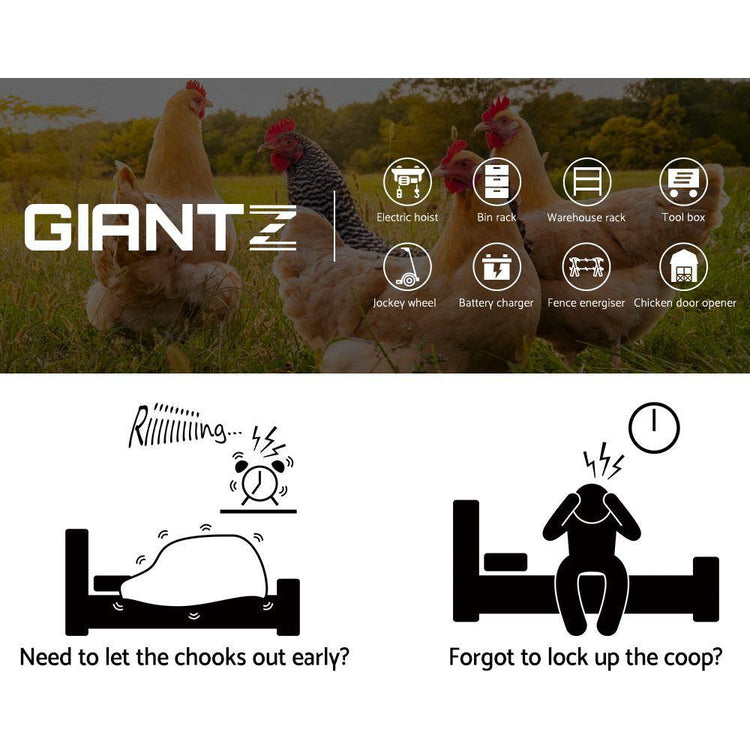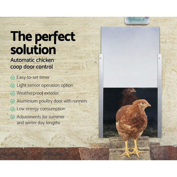 Need to let the chickens out early every day? Or to close the coop on time to keep predators and vermin out? Our Giantz Automatic Chicken Coop Door Control takes all the hassle away and lets you do the tasks easily and timely. Designed to operate on a timer and a light sensor that automatically adjusts for summer and winter day length, the coop door control uses an efficient motor with braided rope for strength and durability. The door and rails are made of alumumium for longlasting use and rust prevention. It also has a spring buffer to cushion the impact of the door operations. The control utilises a photosensitive resistance regulator and also features a digital display for easy monitoring. Powered by four AA-sized battery, the coop door control has a low battery warning light for convenient use. The entire control is weatherproof and all mounting screws are provided for a fast set-up.
