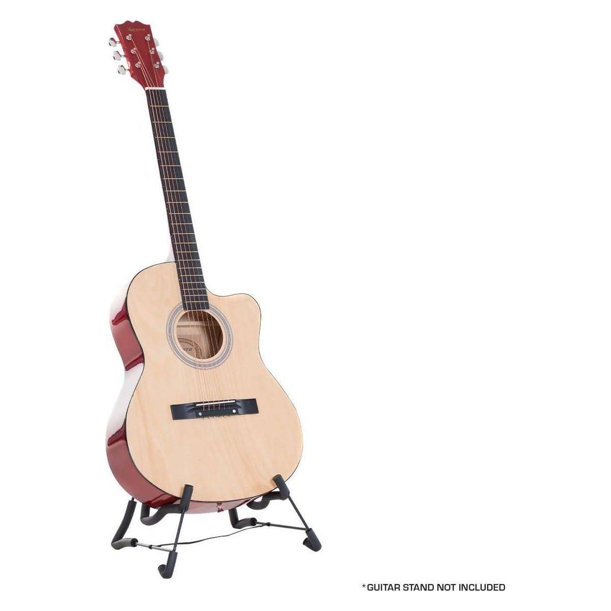 This full-sized, 40-inch guitar is ideal for taller players The cutaway allows for easier access to the top frets, so you can play and master the chords faster. This set also includes bonus strings, two guitar picks, a shoulder strap, and a protective carry bag.
