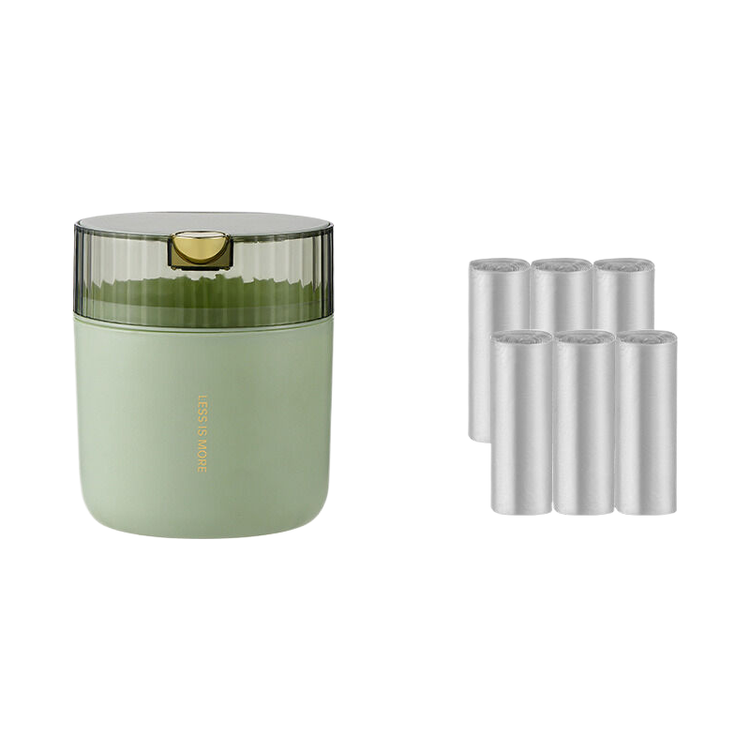 Light cedar green desktop garbage bin (standard 6-roll garbage bag) 14cm * 15cm (including buttons) * 16cm, material: transparent: PET gold-plated: ABS solid color: PP, packaging method: independent cardboard box+bundling